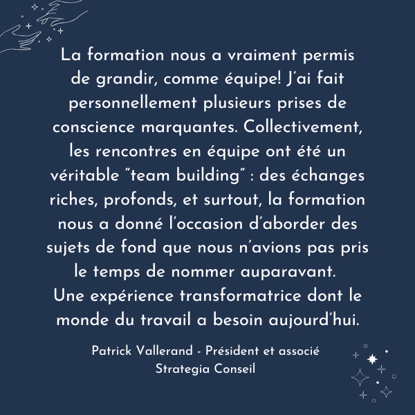 Un module essentiel pour approfondir votre relation à vous-même, enrichir vos relations aux autres… et créer un milieu de travail où l’authenticité devient une vraie force collective.