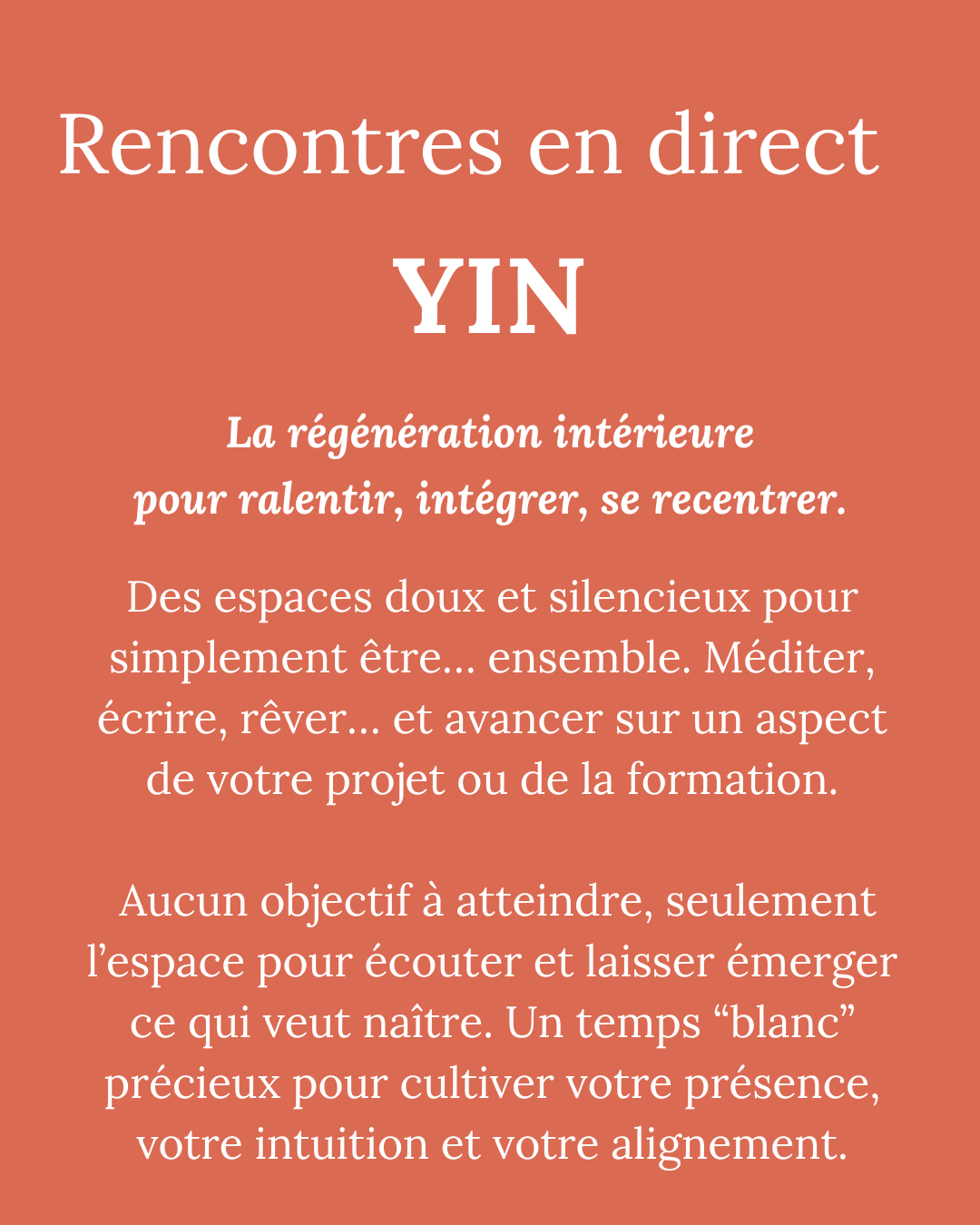 → Espaces YANG - entre 12h et 13h (Qc) - 18h (Paris) : 20 octobre 2025, 17 novembre, 15 décembre et 19 janvier 2026.